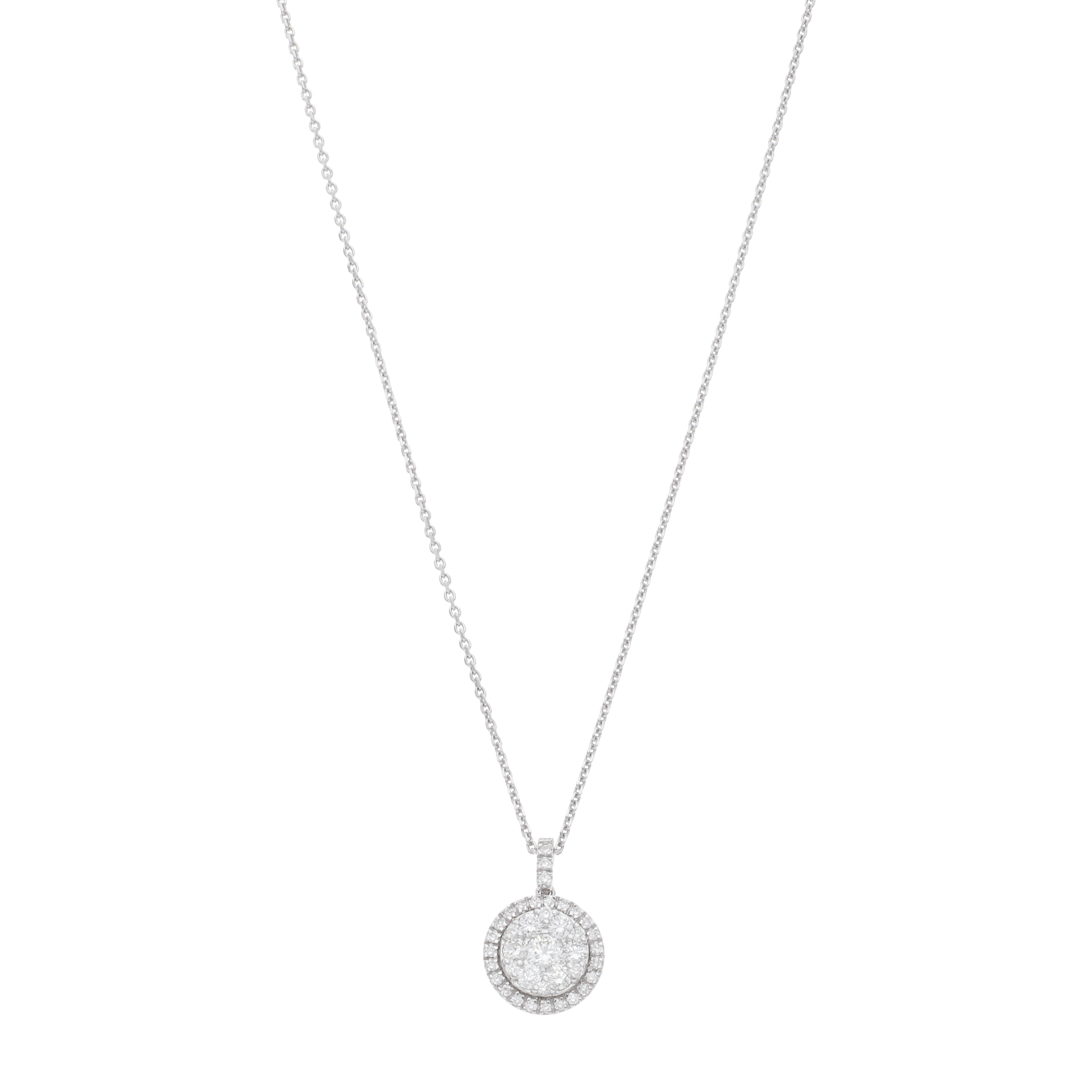 Cadena en oro blanco 14K con dije redondo de diamantes 0.63ct y broche de perico (42 cm).