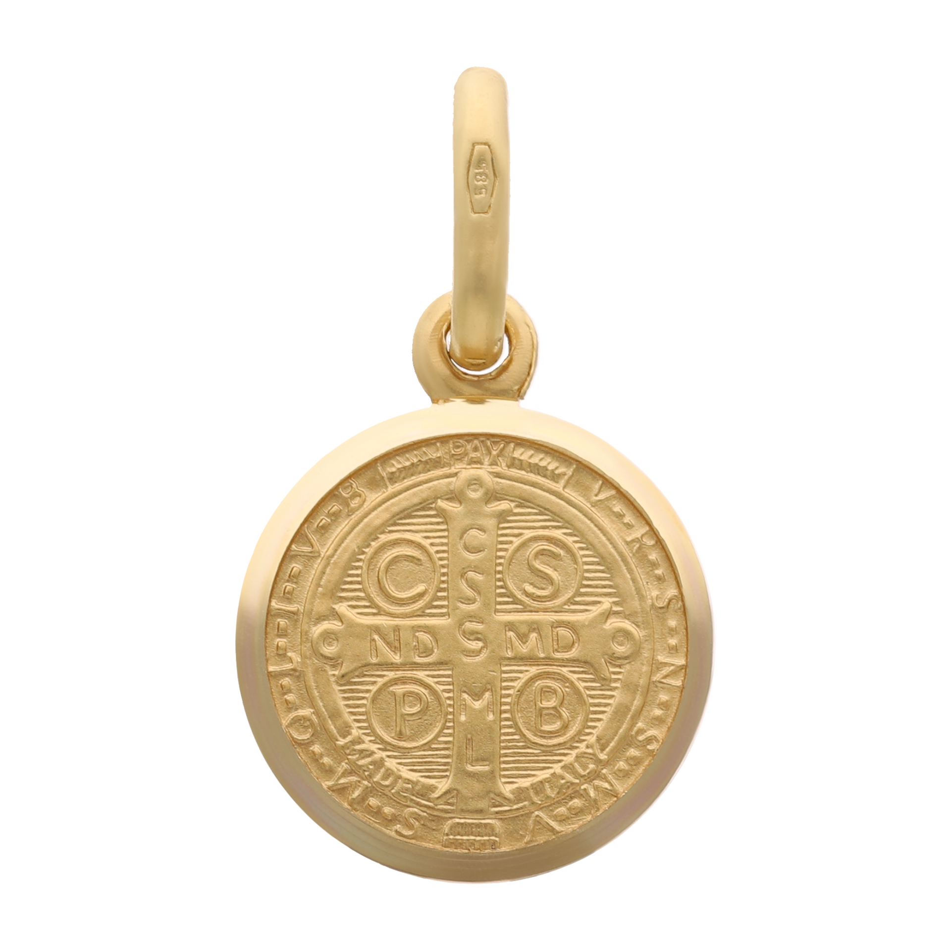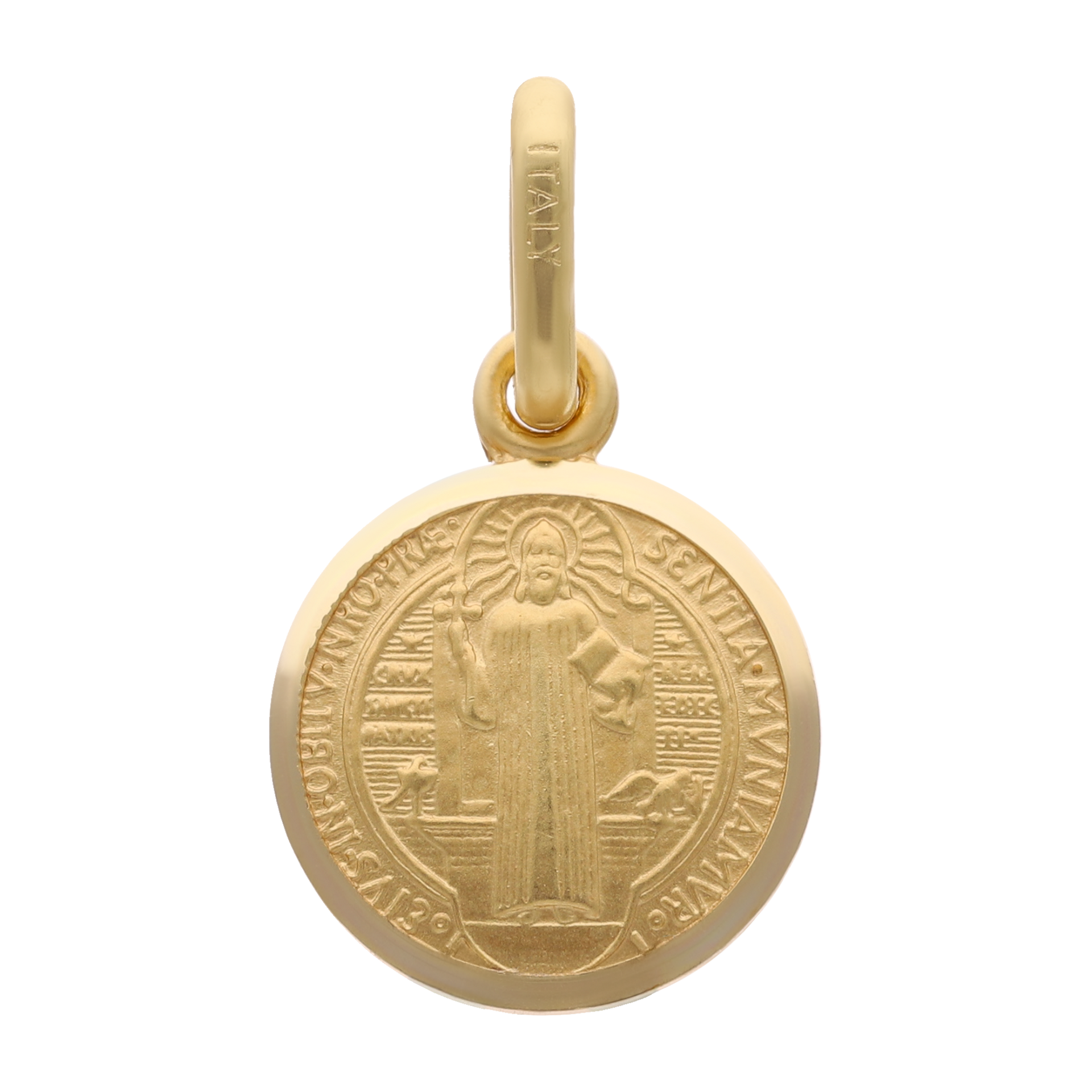 Medalla en oro amarillo 14K 1.4 gr con la imagen de San Benito en dos vistas en terminado mate y bisel liso (11 mm).
