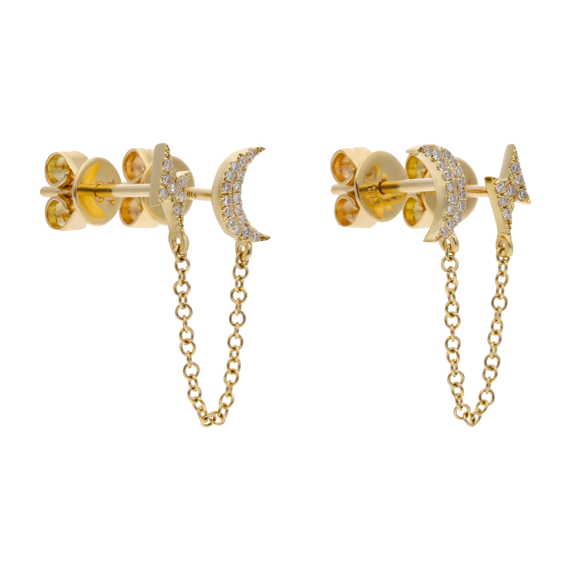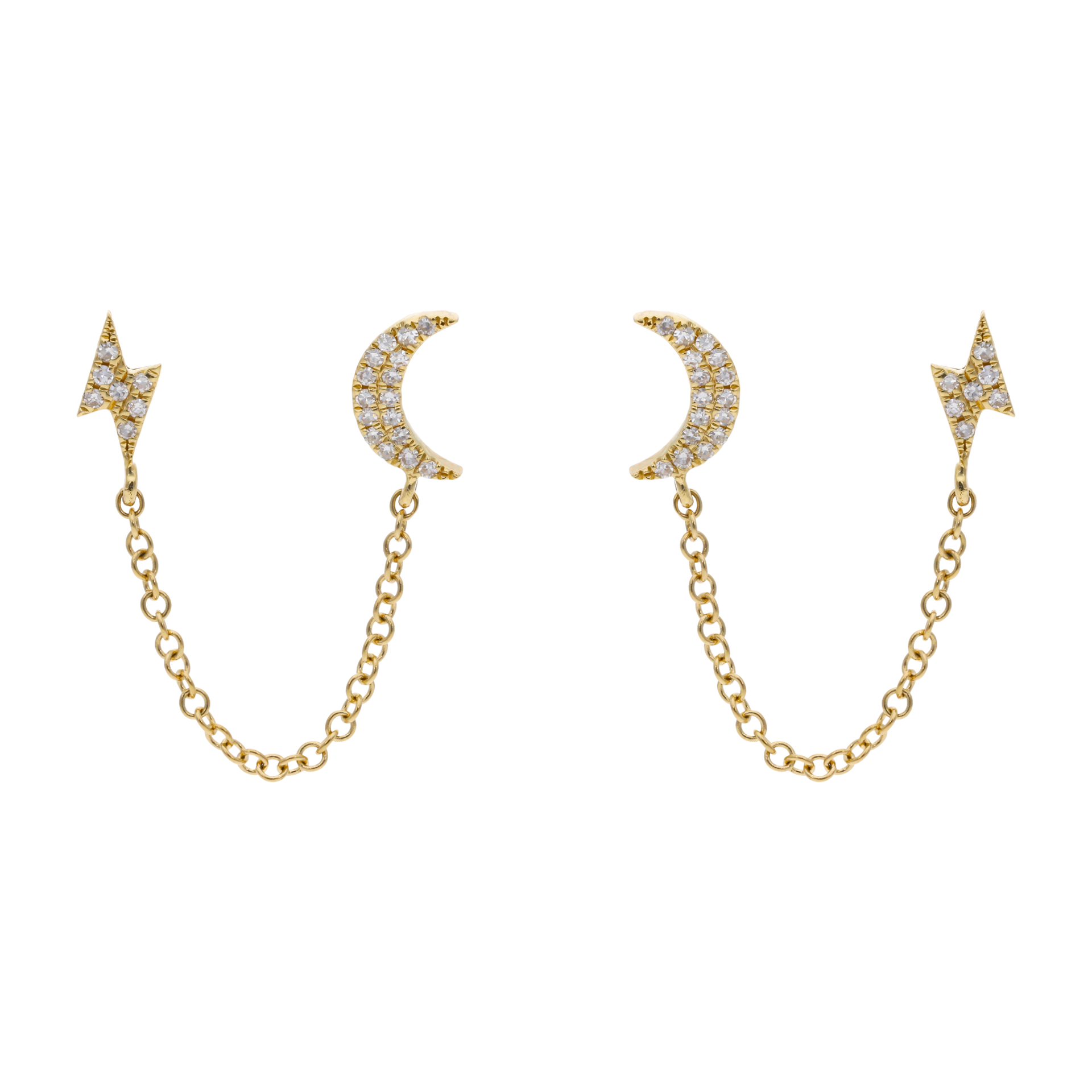 Broquel piercing en oro amarillo 14K con cadena, luna y rayo de 46 brillantes 0.09ct y sistema de mariposa.
