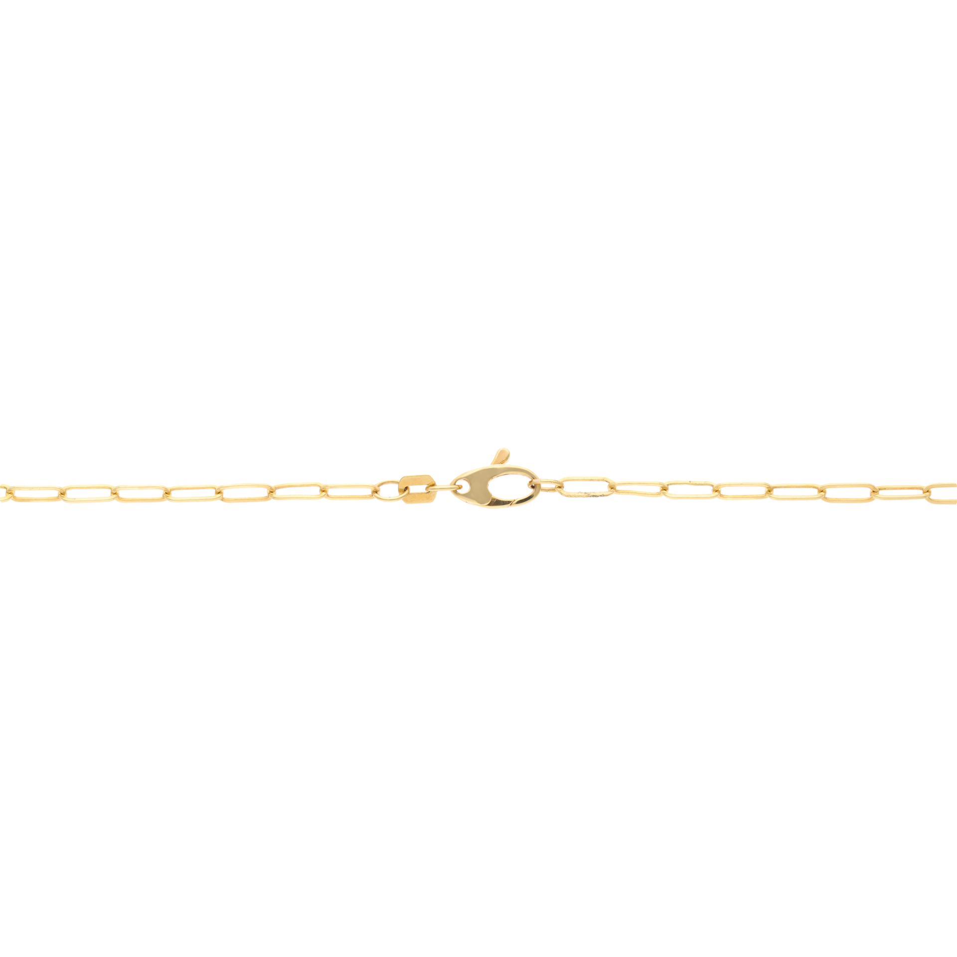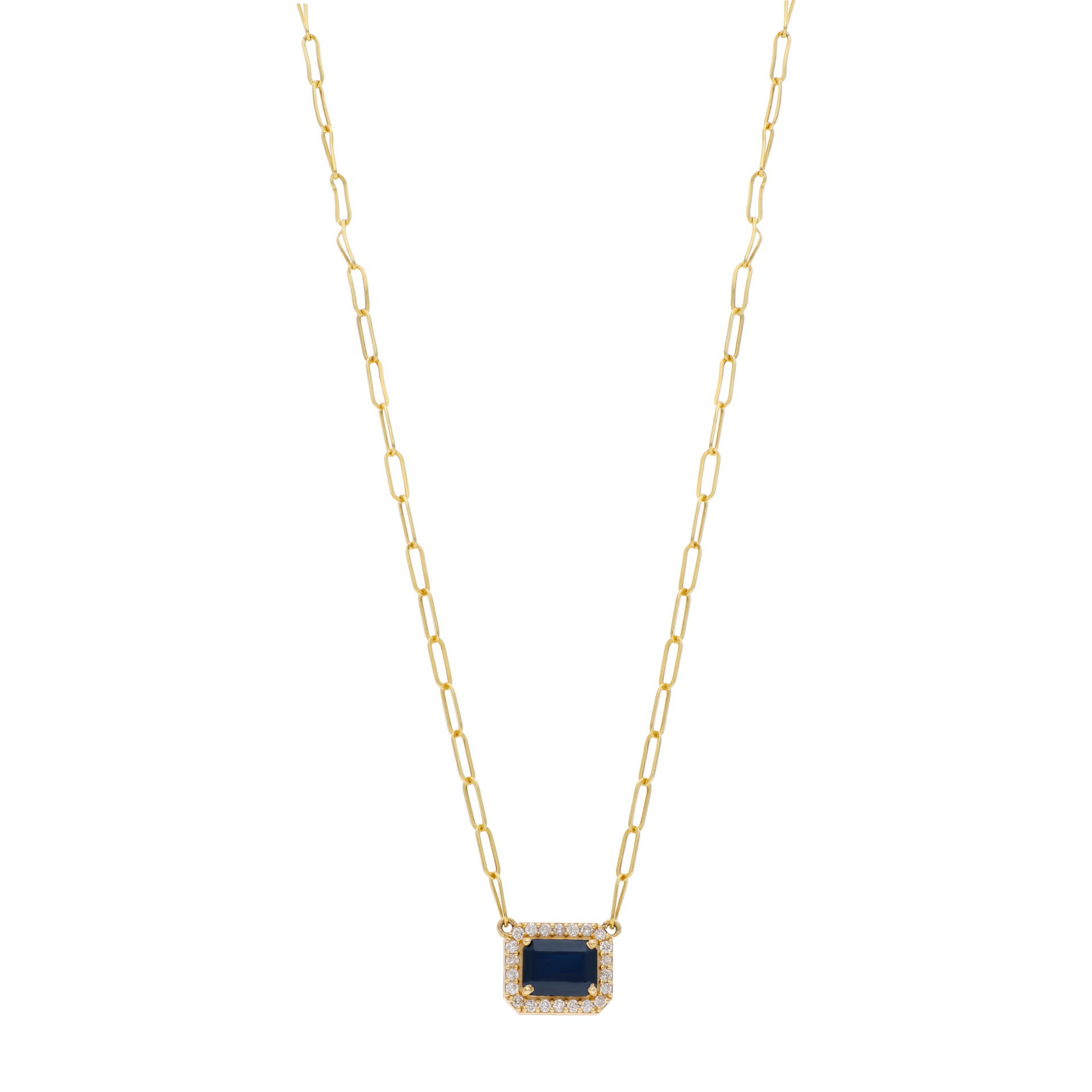 Cadena eslabón clip en oro amarillo 14K con dije de 1 zafiro 1.98ct, bisel de diamantes 0.25ct y broche de perico (44 cm).