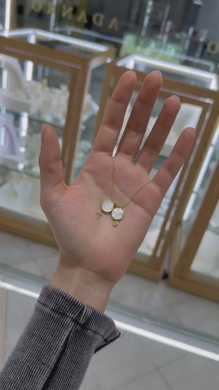 Cadena con escapulario redondo en plata amarilla y madre perla con la imagen de la Virgen del Carmen, el Sagrado Corazón y dijes colgantes, con broche salvavidas (40 cm y extensión de 5 cm).