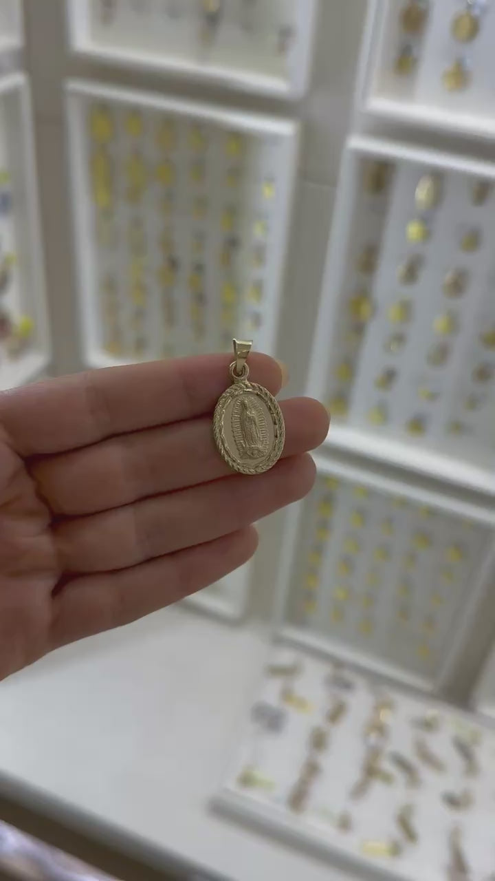 Medalla oval en oro amarillo 14K 4.3 gr con la imagen de la Virgen de Guadalupe en terminado mate y bisel de soga (23 mm x 18 mm).