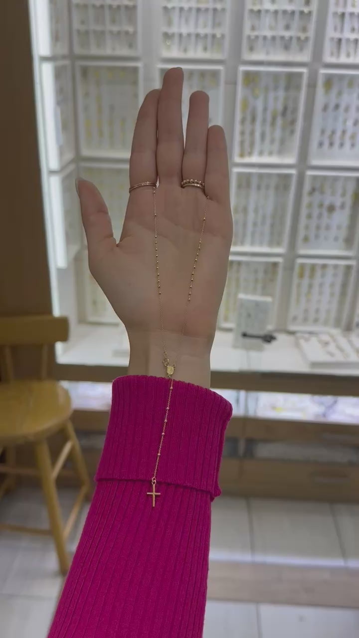 Rosario completo en oro amarillo 14K 2 gr muy delgado con broche salvavidas, con una cruz y una medalla escapulario con la imagen del Signo Mariano y la Virgen de Guadalupe (58 cm).